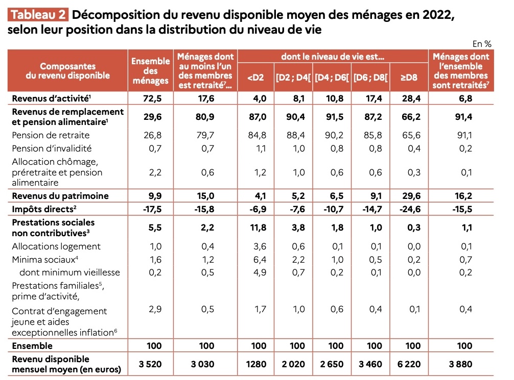 Pour ces ménages dont l’ensemble des membres sont retraités, les revenus d’activité et les revenus patrimoniaux représentent plus de 23% du revenu disponible. Plus de 15% des revenus disponibles sont ensuite prélevés sous l’effet d’impôts directs. Pour les ménages dont au moins un des membres est retraité, ces "autres revenus" représentent un peu moins d’un tiers du revenu disponible, et ce qui est reversé en impôts directs représente environ la moitié de ce montant (32,6% et 15,8% respectivement en 2022).